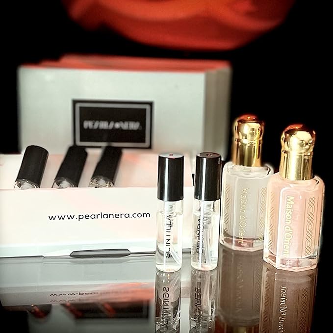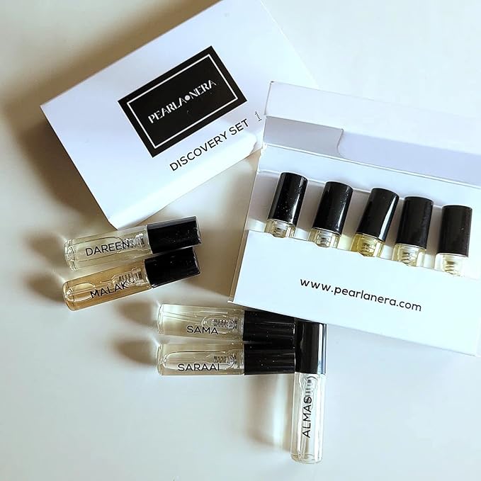 - [ABOUT PEARLANERA]: These artfully curated vials house five of the brands’s most sought-after fragrances in each of its four (4) released collections - that's a total of 20 perfumes to experience; Carefully selected to provide a guide of sorts through four olfactory landscapes - a range of Florals, Artisanal blends, Oriental flair, and an Arabian Oud in Orientare Intense. It is presented in a decked-out black and white box, with a handy cap to keep them safe from bumps in your handbag.