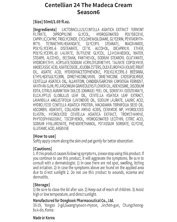 - CENTELLIAN 24 MADECA CREAM (SEASON 6, 50ml/1.7fl oz) - The active ingredients, TECA (titrated extract of centella asiatica) and centella asiatica extract ferment filtrate, work synergistically to stimulate collagen production and repair damaged skin, reducing the appearance of fine lines and signs of aging.