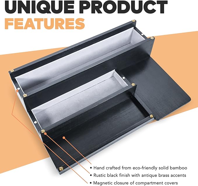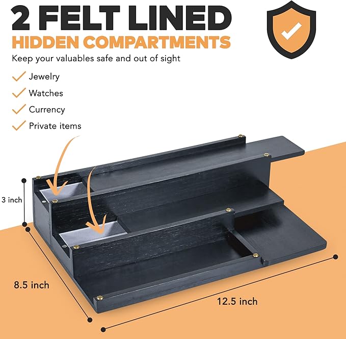 - HIDDEN COMPARTMENTS - With its 2 felt lined hidden compartments, your valuables such as jewelry and watches will be kept safe and out of sight. Remove compartment cover for alternate use and organize your mail envelopes, currency bills and credit cards. When in use, compartment covers are magnetically secured in place.