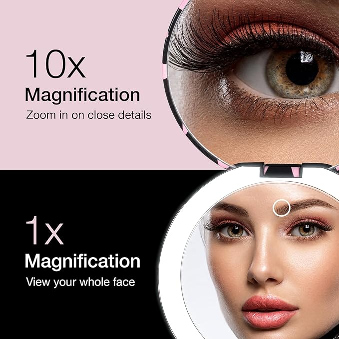 - Double-sided magnification (1x and 10x) so you can apply a full face of makeup, do a quick touch-up on the go, or focus on a detailed task like tweezing or inserting contact lenses