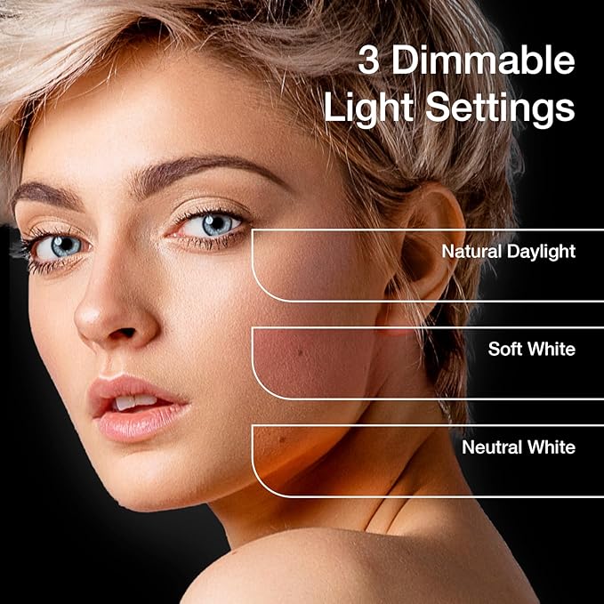 - Choose your lighting with 3 dimmable light settings (warm, neutral, and natural daylight) to ensure that your makeup is color-correct and flawless anywhere, anytime