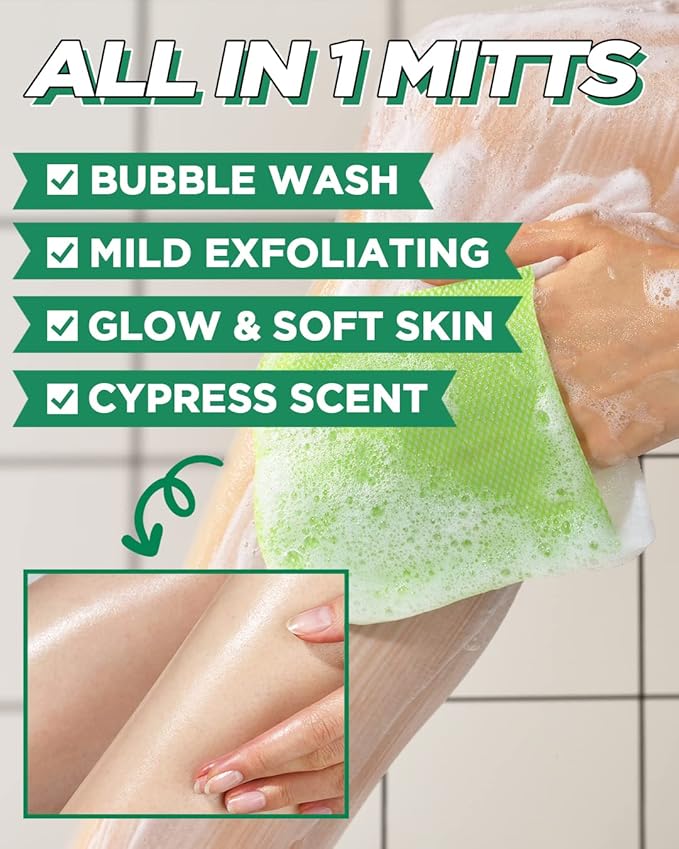 - MILDY SCENTED FOR A REFRESHING BATH: These exfoliating body scrub gloves are enriched with hinoki cypress scent to ease stress and tension, creating a soothing and luxurious bath time experience. This exfoliating mitt effectively removes excess oils from the skin, making them perfect for sensitive, oily, or acne-prone skin.