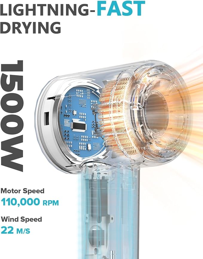 - 【High-Speed & Fast Drying No Heat Damage】 Fentgo hair dryer is equipped with 110,000RPM high speed brushless motor, provides a strong wind speed reaches 22m/s, which can quickly dry your hair in 2-8 minutes.Professional hair dryer built-in intelligent temperature control processor, real-time monitoring and regulation of high temperature, to avoid your hair from high temperature damage.
