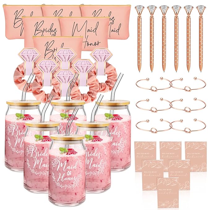- What You Will Get: this package comes with 6 pieces of glasses, 6 pieces of makeup bags, 6 pieces of cards, 6 pieces of scrunchies, 6 pieces of bracelets and 6 pieces of diamond pens, 36 pieces in total, the quantity is sufficient to meet your wedding party decoration needs