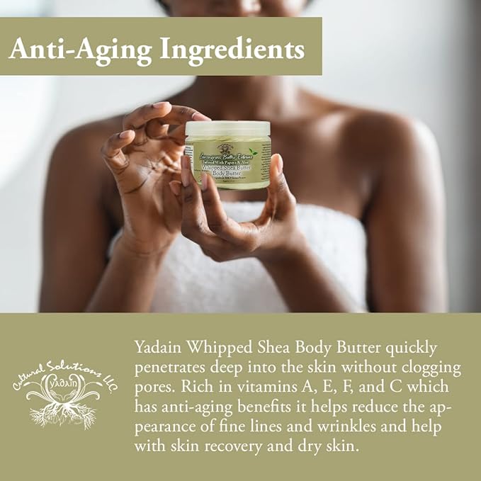 - POWERFUL NATURAL ANTI-AGING INGREDIENTS: This Yadain Whipped Shea Body Butter feels fantastic on the skin, it quickly penetrates deep into the skin without clogging pores and delivers its nutritional payload very effectively. Rich in vitamins A, E, F, and C which has anti-aging benefits that help reduce the appearance of fine lines and wrinkles and help with skin recovery and dry skin.