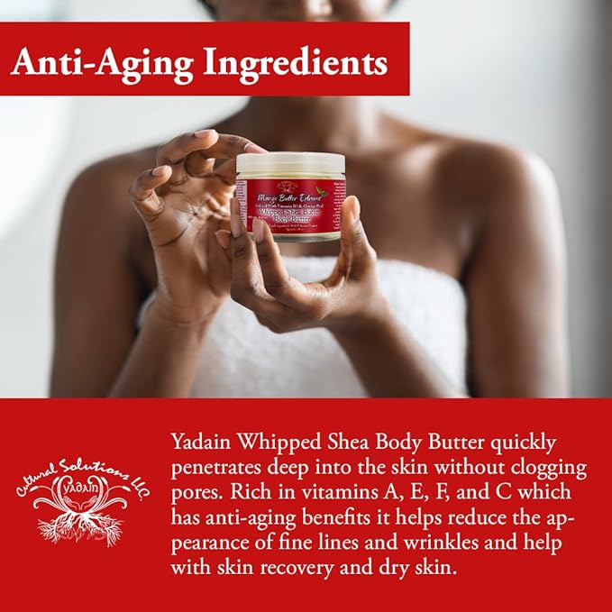 - POWERFUL NATURAL ANTI-AGING INGREDIENTS: This Yadain Whipped Shea Body Butter feels fantastic on the skin, it quickly penetrates deep into the skin without clogging pores and delivers its nutritional payload very effectively. Rich in vitamins A, E, F, and C which has anti-aging benefits that help reduce the appearance of fine lines and wrinkles and help with skin recovery and dry skin.