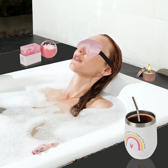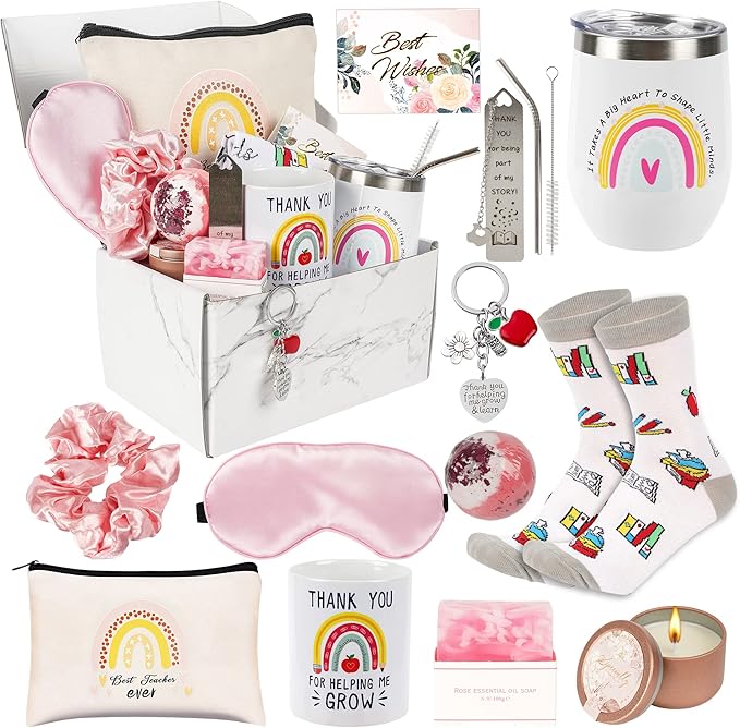 - Amount of product: you will get in total of 1pcs wine tumbler, 1pcs bookmarks, 1pcs ceramic pen holder,1pcs makeup pouch cosmetic bag ,1pcs teacher keychain,1pcs rose bath sall ball, 1pcs bluebell candle,1pcs socks,1pcs sleep mask,1pcs scrunchies hair tie,1pcs soap,1pcs greet card,which is packaged in a beautiful gift box to be ready for gift giving, nice appreciation gift set for a new teacher, retiring teacher, favorite teacher, teacher's assistant or aide