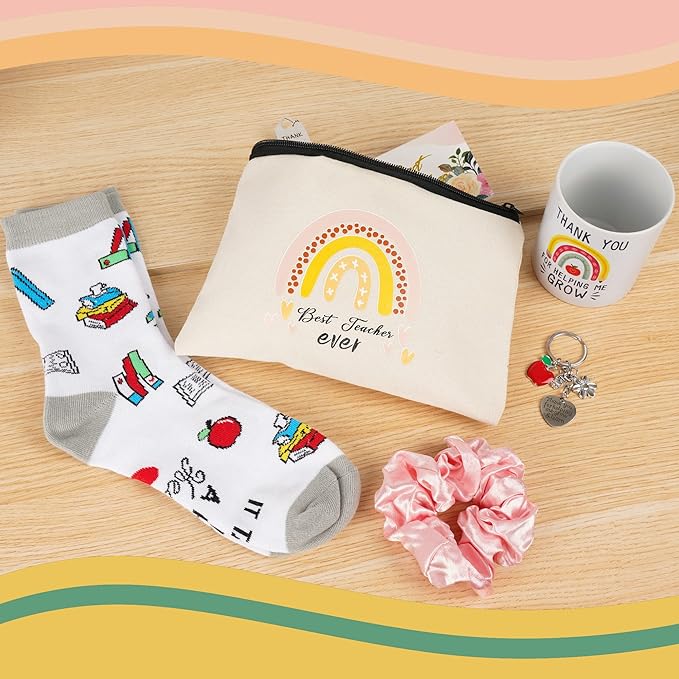 - Funny design : Teacher gift box used colorful colors and elements of rainbow, apple, stationery, symbolizing sunshine and beauty. On coffee mug, keychain, bookmark, printed the words of gratitude to the teacher, express the best wishes to the teacher. When teacher uses it, they can feel the warmth and encourage them to work harder and give full play to their value