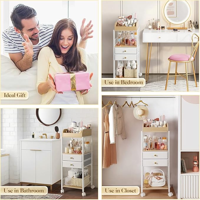 - 【Newest Floor Makeup Organizer】This makeup organizer with open spaces and storage drawers is designed to keep the skin care products, cosmetics, makeup accessories, hair tools, bags organized. It can be fixed beside bathroom vanity and bedroom dresser. The sleek and modern finish is an easy fit for home organization.