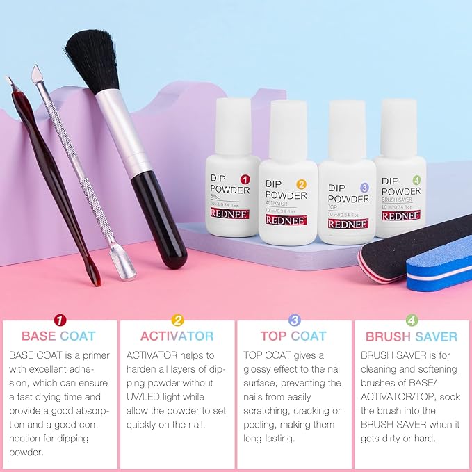 - Included Components : 24 Color Dip Powder, Base Coat, Top Coat, Activator, Brush Saver, Cuticle Trimmer, Cuticle Pusher, Nail File, Nail Buffer, Dust Brush, Lifetime Customer Support 24 Color Dip Powder, Base Coat, Top Coat, Activator, Brush Saver, Cuticle Trimmer, Cuticle Pusher, Nail File, Nail Buffer, Dust Brush, Lifetime Customer Support