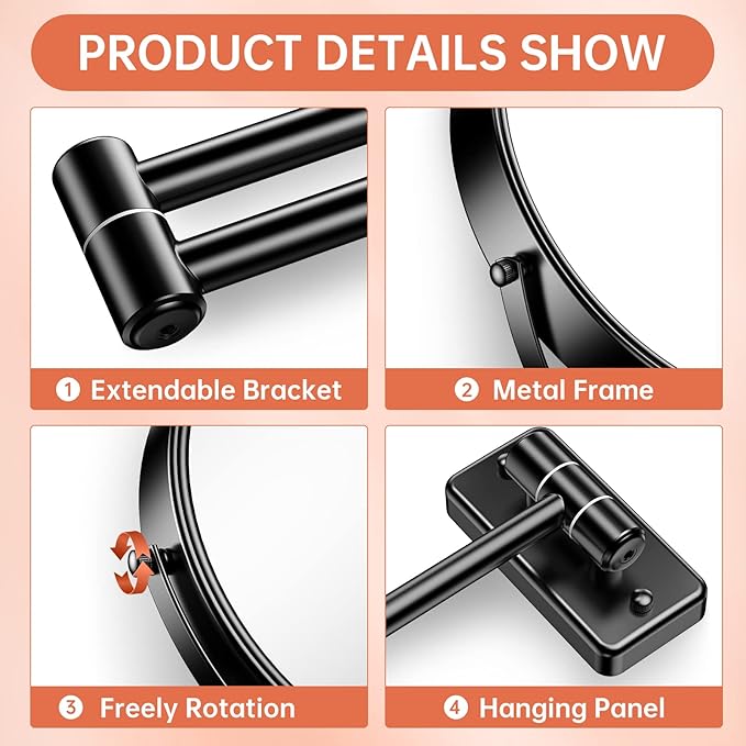 - 【9 INCH SUPER LARGE SIZE MAKEUP MIRROR】-With a generous 9-inch diameter, this oversized mirror ensures that you can see your entire face. The extendable arm and metal frame are made of top-quality materials, ensuring resistance to rust and corrosion, thus protecting the mirror from damage. This mirror is electroplated, making it waterproof and smooth without depositing scale