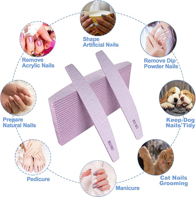 - Durable and Coarse 80 Grit: The 80 grit nail files are super coarse, so that they can trim much more efficient and faster to remove false nails, gel nails, acrylic nails, dip powder nails, poly extension nails, false tips, etc.; They are sturdy, durable, and thick enough to last a longer time, and they are reusable and washable, making them a great addition to any manicure kit;