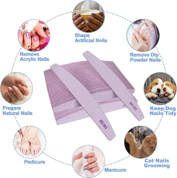 - Durable and Coarse 80 Grit: The 80 grit nail files are super coarse, so that they can trim much more efficient and faster to remove false nails, gel nails, acrylic nails, dip powder nails, poly extension nails, false tips, etc.; They are sturdy, durable, and thick enough to last a longer time, and they are reusable and washable, making them a great addition to any manicure kit;