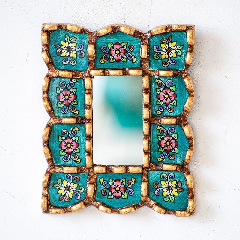 - HANDMADE IN PERU: This accent Mirror ”cuscaja Style” is created entirely by hand using the peruvian reverse painted glass technique. Hand-painted glass are later placed in the wooden frame then covered in bronze leaf or silver leaf.