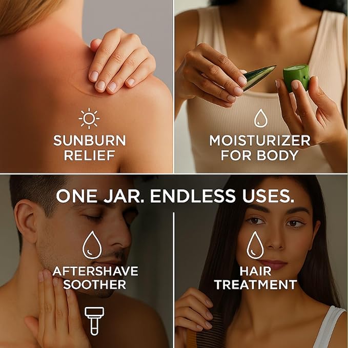 - Everyday Home Hydration & Repair – Our spacious jar (10.5 oz) delivers 98% organic aloe vera gel with Niacinamide & Hyaluronic Acid for deep, soothing moisture across the body—perfect for daily skin care, face, arms, legs, and hands.