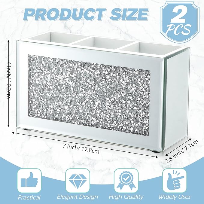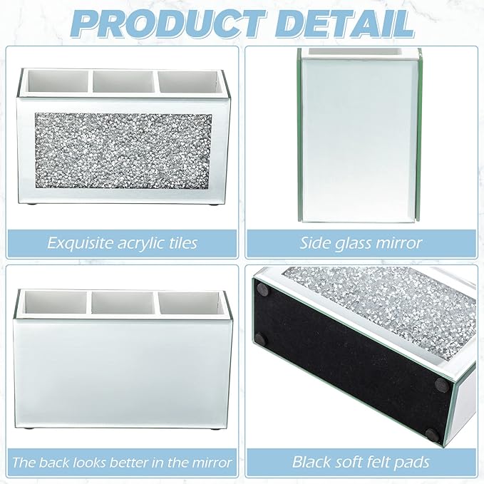 - Crushed Diamond Makeup Brush Holder: mirrored remote control holder with quality silver mirror and sparkling twinkling bling crush diamond, exquisite engraving and bevel edging, smooth, beautiful and fashionable