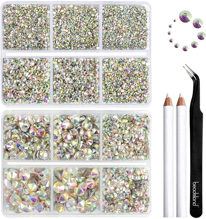 Beadsland 8300PCS Flatback Rhinestones, AB Crystal Rhinestone Round Crystal Rhinestones for Crafts, Mixed 10 Sizes with Wax Pencil and Tweezer Kit, SS3-SS30, Crystal AB