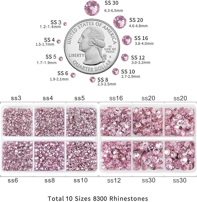 - Pack of 2 box, total 8300 pieces pink rhinestones for nails in 10 sizes,two wax pencils and one tweezer for glass rhinestones flatback.