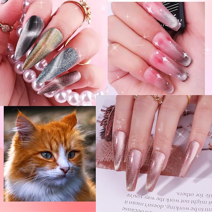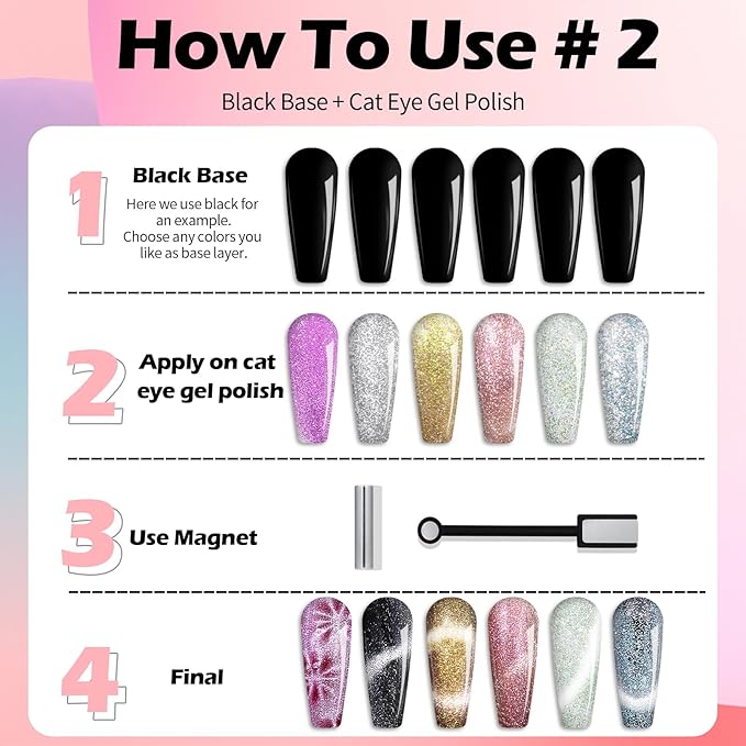 - Long-lasting:Having innovative formula of our cat eye gel nail polish kit, you can wear glossy nails longer (up to three weeks or more). Holographic magnetic cat eye gel polish set is perfect for all daily working or dating, vacations party or ceremony activity.