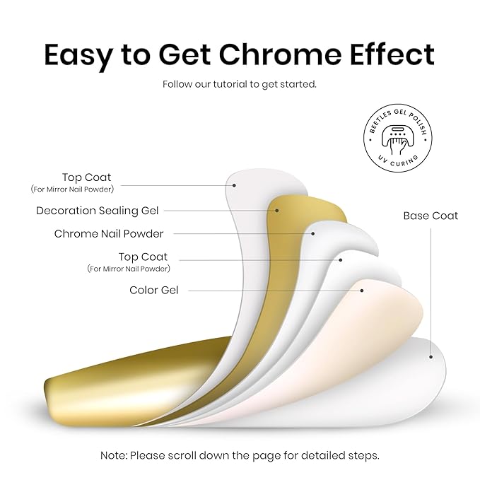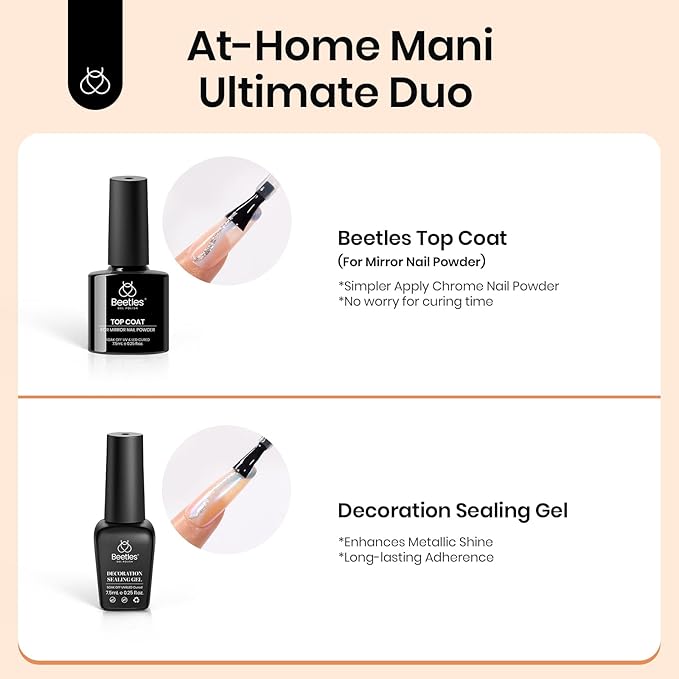 - 【Easier Usage】This beetles powder kit is great for beginners, metallic nail polish chrome perfect for nail art. It requires a base oil and a no-wipe top coat that can be easily applied when used correctly, giving you a beautiful and fashionable manicure. Perfect beauty gift sets for nail art lovers.