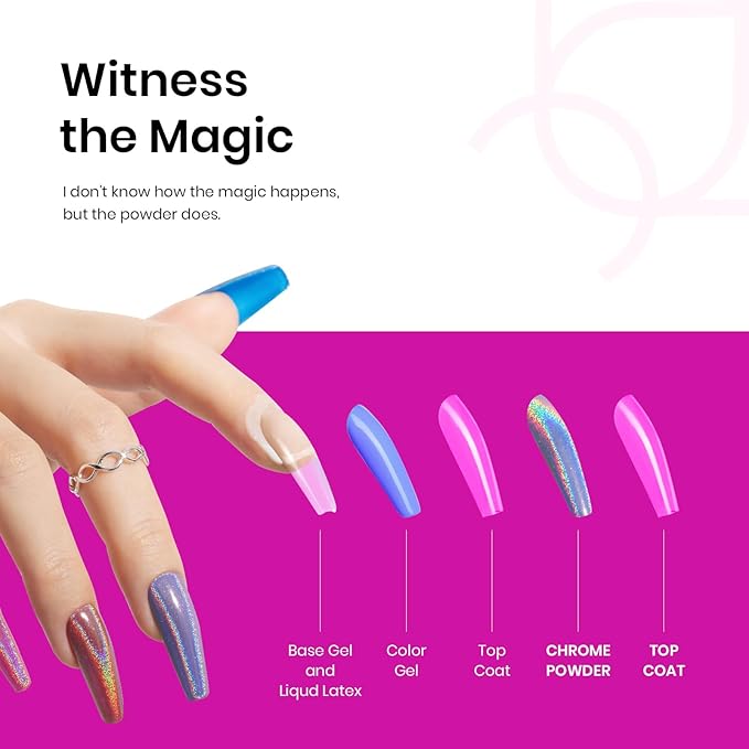 - What You Get: 8pcs(each 0.5g) white pink blue silver fuchsia chrome nail mirror pigment powders and 8pcs Double-ended Sponge Stick, 1pcs Dust Brush, 1pcs Liquid Peel Off Latex Tape, which needs to be used with gel nail polish and no wipe top coat.