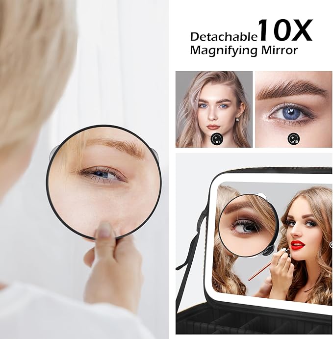 MOMIRA Travel Makeup Bag Cosmetic Bag Makeup Organizer Bag with Lighted Mirror, Adjustable Brightness in 3 Color Scenarios, Waterproof Makeup Train Case, Gift for Women - Khaki (Large)
