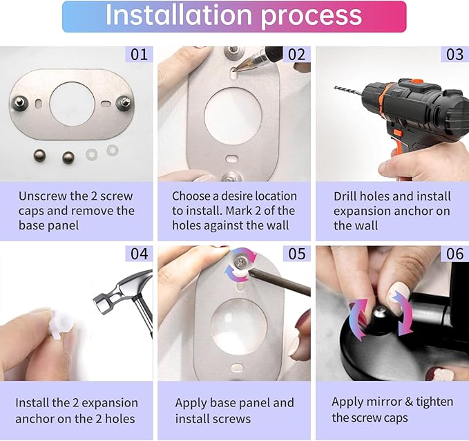 - 【Easy to Install Wall Mounted Mirror】This magnifying mirror wall mounted is very simple to install, Please check that all accessories are complete before installation, the base can be installed to any wall with simple screws (Please fully charge it before the first use after installation).