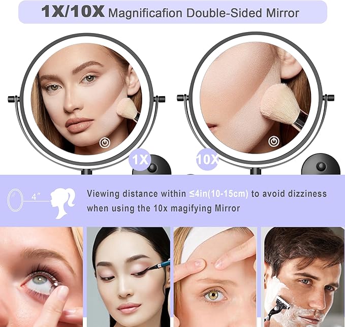 - 【10X/1X Bathroom Magnifying Mirror Wall Mounted】 A combination of a flat mirror and a 10X magnifying makeup mirror, providing the perfect makeup experience. HD 1X lighted makeup mirror wall mount for overall makeup and skin care. When you apply eyeliner pencil, eyebrows, shaving or lipstick. The 10X magnifying mirror clearly focuses on facial details. The LED makeup mirror wall mounted with lights can be freely rotated up and down, making it easy to find the perfect angle without any effort.