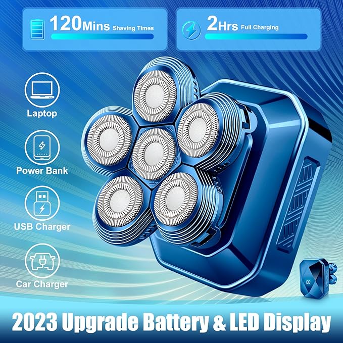 - 【6D Upgraded Shaver Heads】Head shavers for bald men adopt 6D floating shaver heads, which not only increase the usable area of the shaver but also fit the contours of the face and grasp the hair very well. With the powerful motor and sharp blades, it can achieve a comfortable and smooth shaving experience.