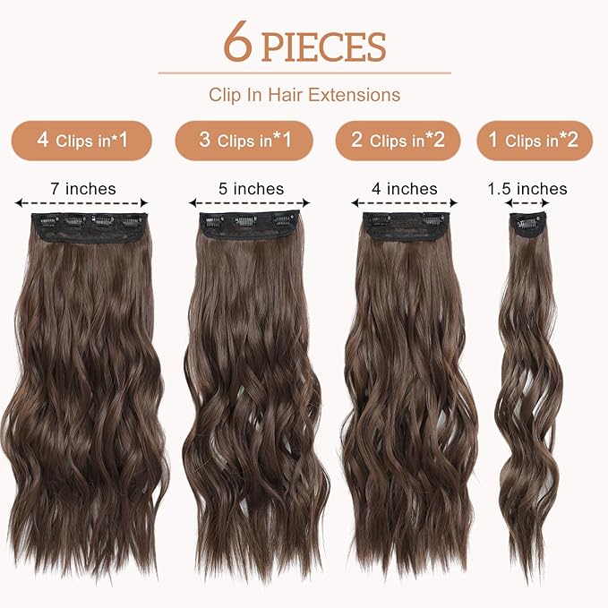 - ❤【Thick Hair Extensions】--20 Inch 6pcs clip in hair extensions, at 230gcan full head looks more beautiful. Each pack includes: 2 pieces of 4 inch wide 2 clip ins hair, 2 pieces of 1.5 inch wide 1 clip ins hair, 1 piece of 5 inch wide 3 clips in weft; 1 piece of 7 inch wide 4 clips in weft. (Weight is within people tolerance.If you feel too heavy, please reduce pieces you wear.)