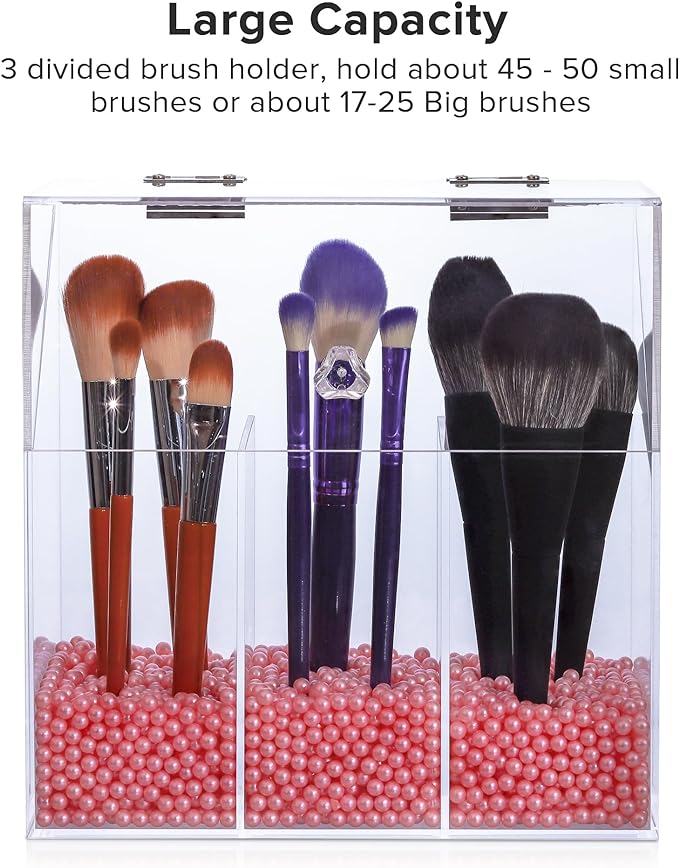 - ✅【Dust-Proof 】--Make up brush holder organizer is an ideal solution for organizing your beauty routine. It comes equipped with 3 fixed compartments that can be used to store makeup brushes, lipsticks or other small items. This acrylic makeup brush holder with lid also helps you easily categorize your makeup and beauty essentials. The dust-proof lid of the makeup brush organizer keeps your brushes clean and dust-free.