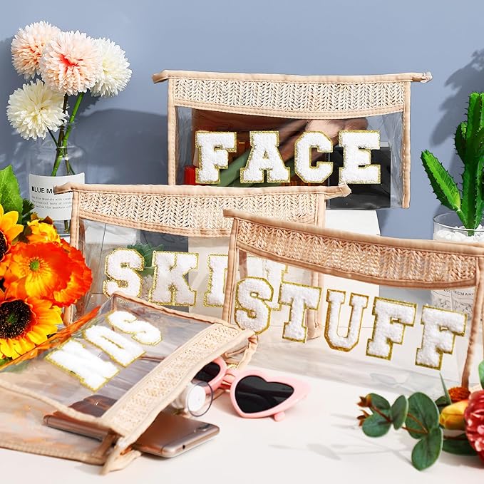 Sanwuta 4 Pieces Preppy Patch Makeup Bag Skin Face Sun Stuff Bag Chenille Letter Clear Straw Cosmetic Bag Waterproof Nylon Toiletry Bag Portable Travel Organizer Zipper Transparent for Women