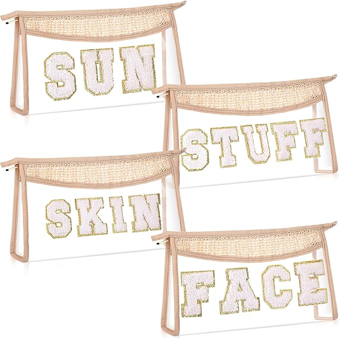 - Package Contains: you will receive 4 pieces of clear cosmetic bags with zipper, printed with 4 different designs, including [STUFF], [SKIN], [FACE] and [SUN], convenient for you to classify your items, enough to meet your daily use and replacement needs