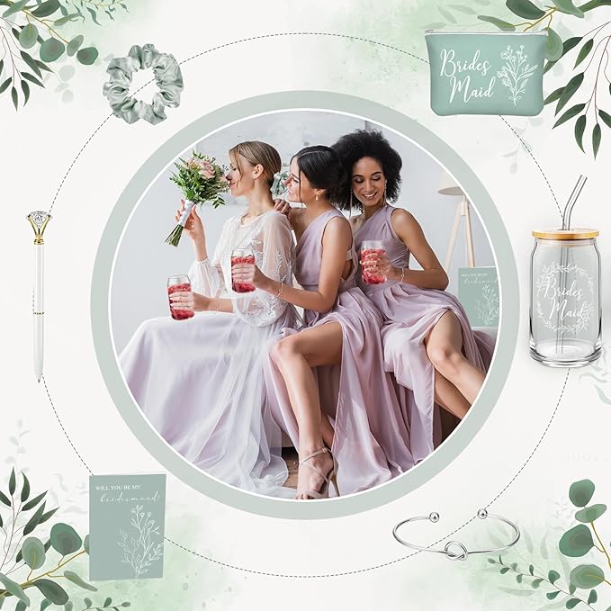 Irenare 36 Pcs Bridesmaid Proposal Gifts Bridal Shower Gifts 16 oz Glass Cup Cosmetic Makeup Bags Invited Cards Scrunchies Hair Knotted Bracelets Diamond Pens Favors for Wedding (Green)