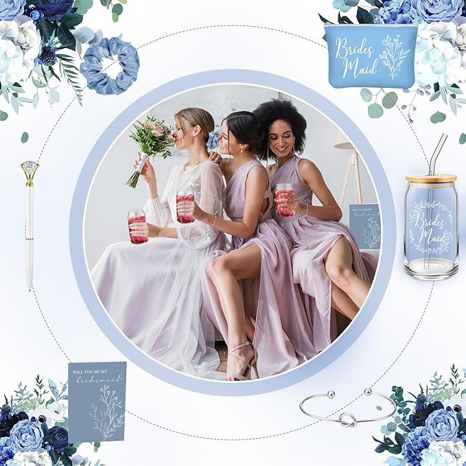 Irenare 36 Pcs Bridesmaid Proposal Gifts Bridal Shower Gifts 16 oz Glass Cup Cosmetic Makeup Bags Invited Cards Scrunchies Hair Knotted Bracelets Diamond Pens Favors for Wedding (Blue)