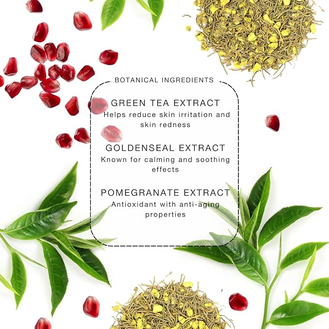 - ANTIOXIDANT HERBAL BLEND - Green Tea Leaf Extract is known for its anti-inflammatory properties that can help reduce skin irritation and skin redness. Horsetail Extract is an antioxidant, loaded with vitamin B5, which is a powerful humectant. Goldenseal Extract and Hops Extract helps to fight inflammation and redness and are praised for their skin calming and soothing effects. Pomegranate Fruit Extract is a known antioxidant with anti-aging and calming properties
