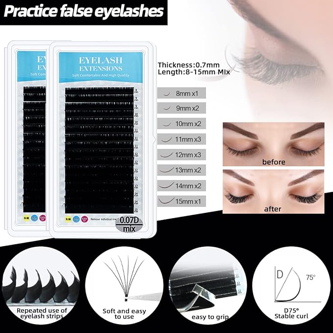 - 【D Curl Lash,Practice Eyelash Strips and Glue】: There are a total of 16 rows in our false eyelashes tray, with 8-15mm eyelashes of different lengths which can perfectly take into account the extension of the upper and lower eyelashes. There are 10 pairs of practice eyelash strips, which can meet your needs. The eyelash glue can quickly adhere to the eyelashes and has strong durability.
