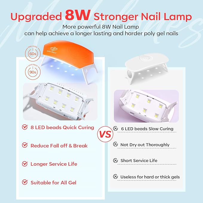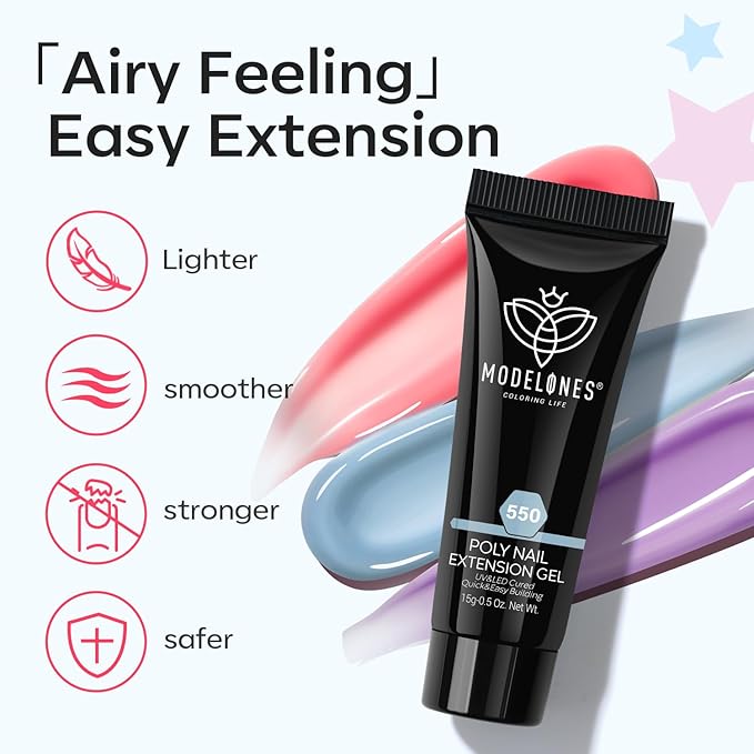 - 【Long-Lasting Result】: Using Modelones poly nail gel kit with u v lamp to create durable nails and stay on well up to 3 weeks without chipping or lifting. For better adhesion, we advices proper nail preparation (filing, buffering, and cleaning) and apply nail dehydrator and primer.Modelones poly nail gel adopt healthy formula,11-toxin free ,no harm to nails bed safer for nail extension, nail strengthen,nail enhacement,apex building ,etc