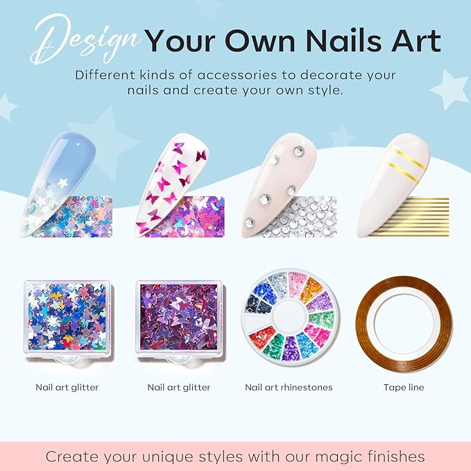 - 【Beginner-Friendly】: Our poly nail gel starter kit provides an easy way to help you master the techinique and do your own DIY nails at home. 32 different colors, from nude to bright, dark to glitter colors, cover all seasons poly mani need, plus a variety of glitters & rhinestone gives you endless nail art creative possibilities. The poly nail kit also comes with all basic manicure tools like nail tips ,nail forms help you create any extension nails sizes and shapes you like
