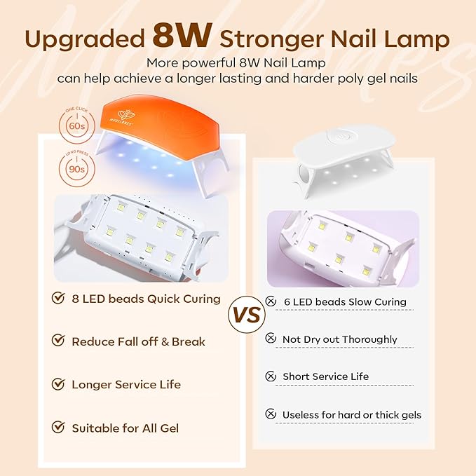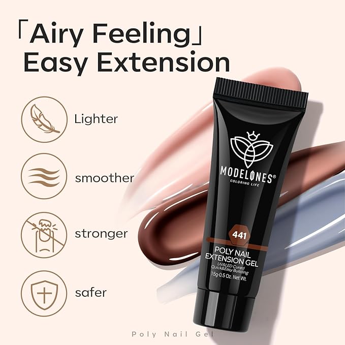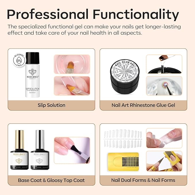 - 【Long-Lasting Result】: Using Modelones poly nail gel kit with u v light to create durable nails and stay on well up to 3 weeks without chipping or lifting. For better adhesion, we advices proper nail preparation (filing, buffering, and cleaning) and apply nail dehydrator and primer.Modelones poly nail gel adopt healthy formula,11-toxin free ,no harm to nails bed safer for nail extension, nail strengthen,nail enhacement,apex building ,etc