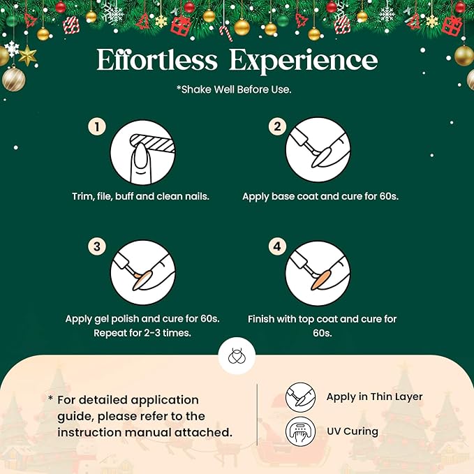 - đăEasy Application & Long-LastingăBeetles gel nail polish lasts for 28+ days with perfect shine under proper application - With base gel top coat under the full application process and needs to be cured under LED/UV light for 60-120 seconds.