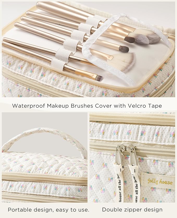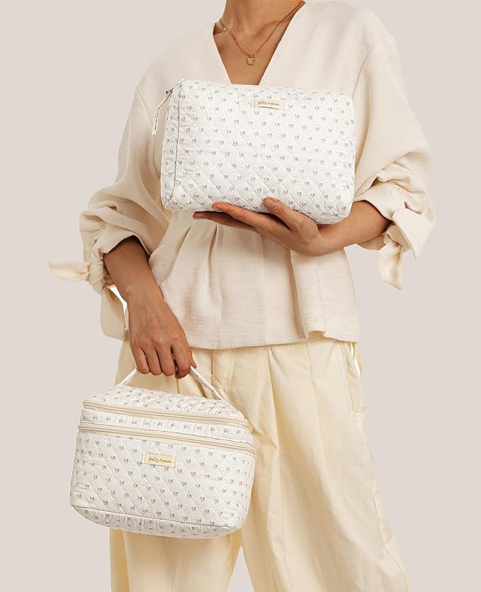 HBselect 2Pcs Travel Makeup Bag, Large Cotton Quilted Makeup Bag Cosmetic Bag Cute Make up Bag Toiletry Bags for Women Girls