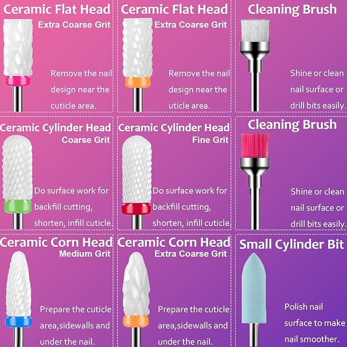 - PACKAGE: 14 x diamond carbide nail drill bits, 9 x ceramic nail drill bits, 3 x tungsten carbide nail bits, 1 x rubber polishing nail bit , 3 x cleaning brushes and 1 x 30 holes nail drill bits holder box. Great for both beginners and professionals