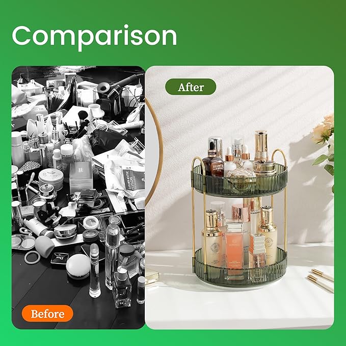 - đăVersatile UsesăThis dresser perfume organizer serves multiple purposes, making it an excellent choice as a cosmetics organizer, perfume holder, lipstick organizer, bathroom countertop organizer, dresser organizer, skincare storage solution. Besides as a makeup holder, you can also use it as a practical lazy susan organizer in the kitchen. Its seamless compatibility with different settings adds a touch of finesse to your house's overall ambiance.