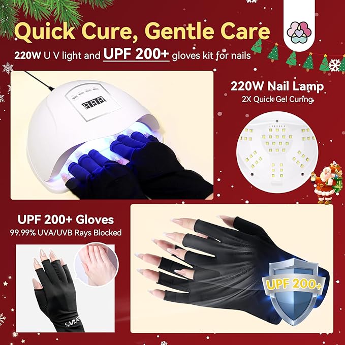 - 220W Nail Lamp with UPF 200+ Gloves: With its high wattage, this nail lamp ensures fast curing times, saving you valuable time during your manicure process. UPF 200+ Gloves shield your hands from potential damage caused by prolonged exposure to U V light during the curing process