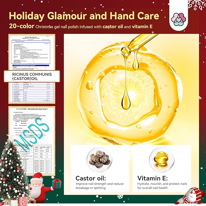 - All-In-One Christmas Gel Nail Polish Kit: The all-in-one Christmas gel nail polish kit features a 20-color green red gold black gel nail polish set, enriched with castor oil and vitamin E for vibrant colors and nail care. It includes a powerful 220W nail lamp for salon-like results, UPF 200+ gloves for U V protection, and 20000 RPM nail drill for easy removal. The kit also provides essential tools and various Christmas nail art accessories to let your creativity shine