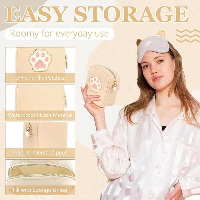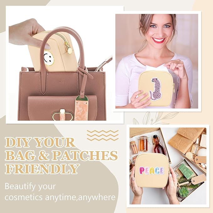 - DIY YOUR BAG & PATCHES FRIENDLY: the cosmetic pouch is made of quality nylon waterproof material and durable gold zipper, looks pretty and fashionable, Which is light and soft to holder, has no peculiar smell, and is easy to clean. Just wipe the stain with a damp cloth, easy to clean, saving your time and energy; The make up pouch has a thick sponge interlayer to maintain shape and protect your personal belongings at all times