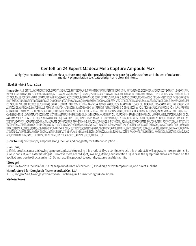 - CENTELLIAN 24 CAPTURE AMPOULE MAX (15ml/0.5fl oz x 3pc) - Experience the power of this premium ampoule that effectively targets and manages multiple skin concerns. Formulated with a high concentration of TECA (titrated extract of centella asiatica) and centella asiatica extract, it works to combat blemishes, reduce the appearance of wrinkles, and enhance skin elasticity.