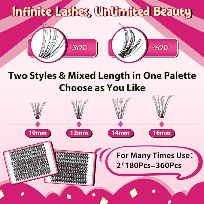 - 360 Cluster Lashes: You can provide 216 lashes in one tray! The blended lengths range from 10mm to 16mm, curls include D.With a variety of styles for you to choose from. You get more lashes and more uses.