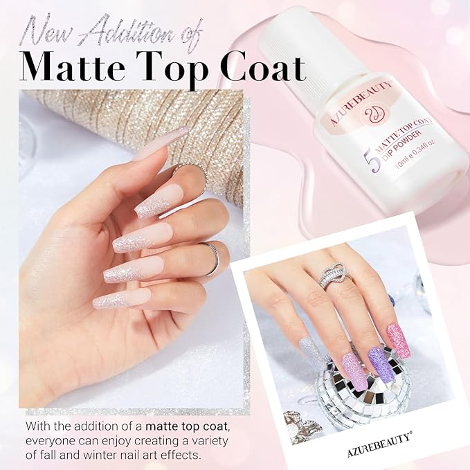 - 30 Pcs Upgraded Dazzling Starter Kit: AZUREBEAUTY 30 Pcs sparkle dip nails powder starter kit: 8*10 g (0.35 Oz) color powder, 4*10 ml dip powder liquid set(base coat/activator/top coat/matte top coat), 2*liquid brush replacement, 1*nail brush,1*nail file, 1*nail buffer, 1*dip powder recycling tray. What's more, 10*nail sticks and 2*orangewood stickers are added to the kit for color testing as well as ease of use